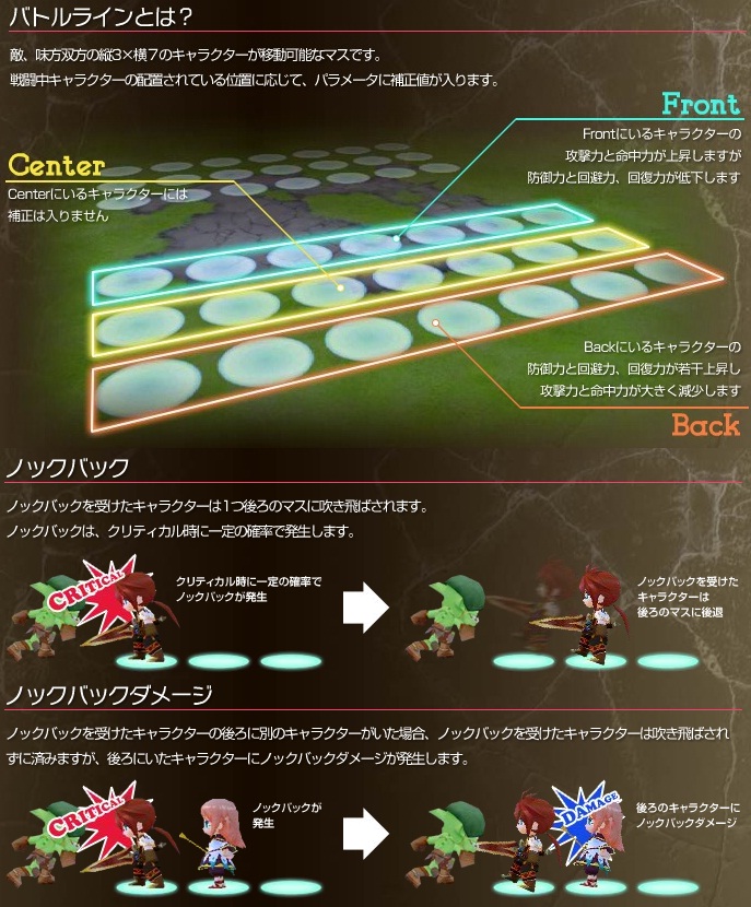 また、そのフィールド拡張に伴い、クリティカルを受けると一定の確率でキャラが「ノックバック」を起こし、強制的に1マス後ろのラインに下がるというシステムも追加。