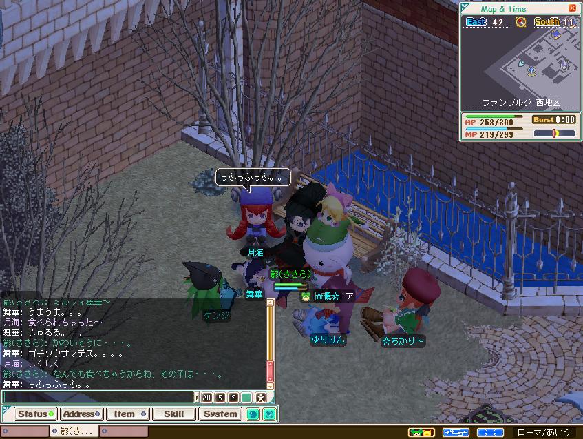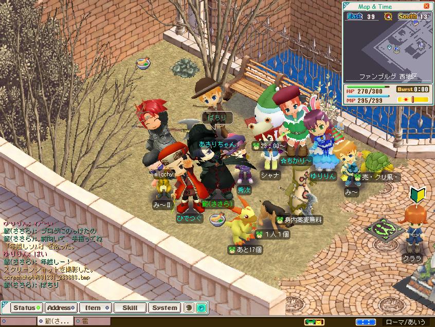 いつもどおり西でのんびりみっちーひなちとお話してると、正月帰郷中でインするはずの無い人がうずうず言いながら現れました。(注:画像の雪だるまから生えてるものを参照)